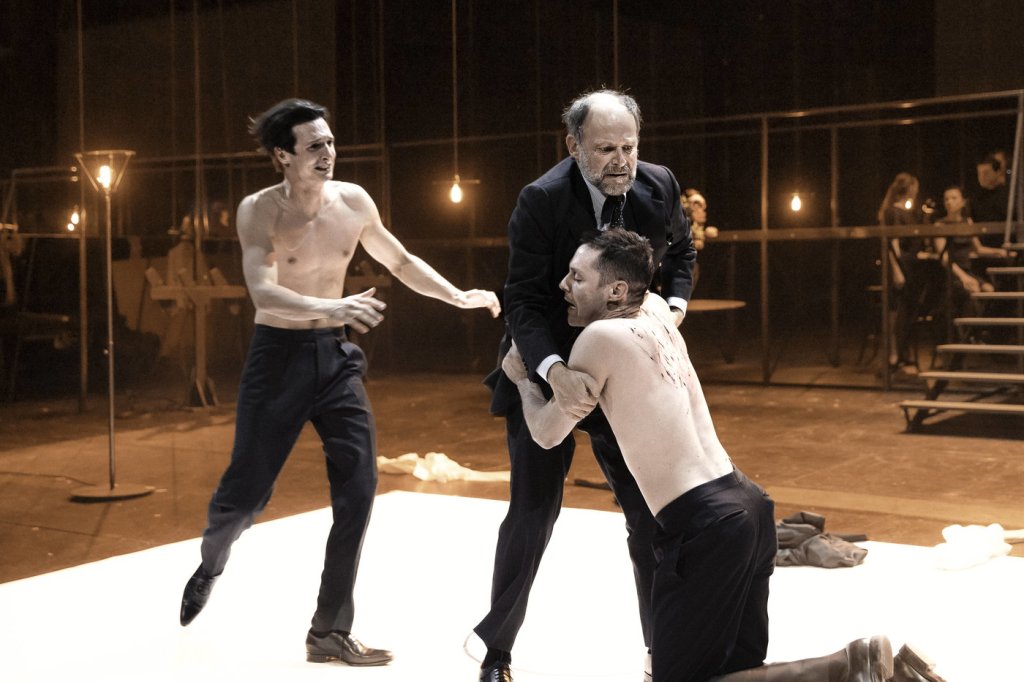 Le tatami au milieu de la scène sur lequel les personnages s’affrontent verbalement ne nécessitait pas que ces derniers se saluent avant d’y mettre un pied. Tout comme les changements de scènes ne réclamaient pas les projections de mots qui les annoncent. Ou bien les techniciens d’être vus par le public. Ou les flash de lumière d’être si répétitifs. Ou encore la musique d’être omniprésente. Ivo Van Hove voudrait faire croire à une mise en scène crue uniquement en dépouillant le plateau. Mais la mise en scène qui anime ce plateau n’a rien de dépouillée. En ne faisant pas confiance aux capacités interprétatives de son spectateur, au découpage de son texte et à l’énergie de ses comédiens il leur impose un amas de coquetteries formelles et d’éléments rythmiques superflus.